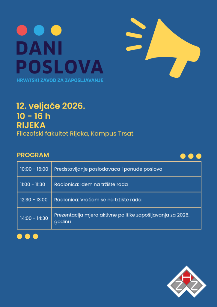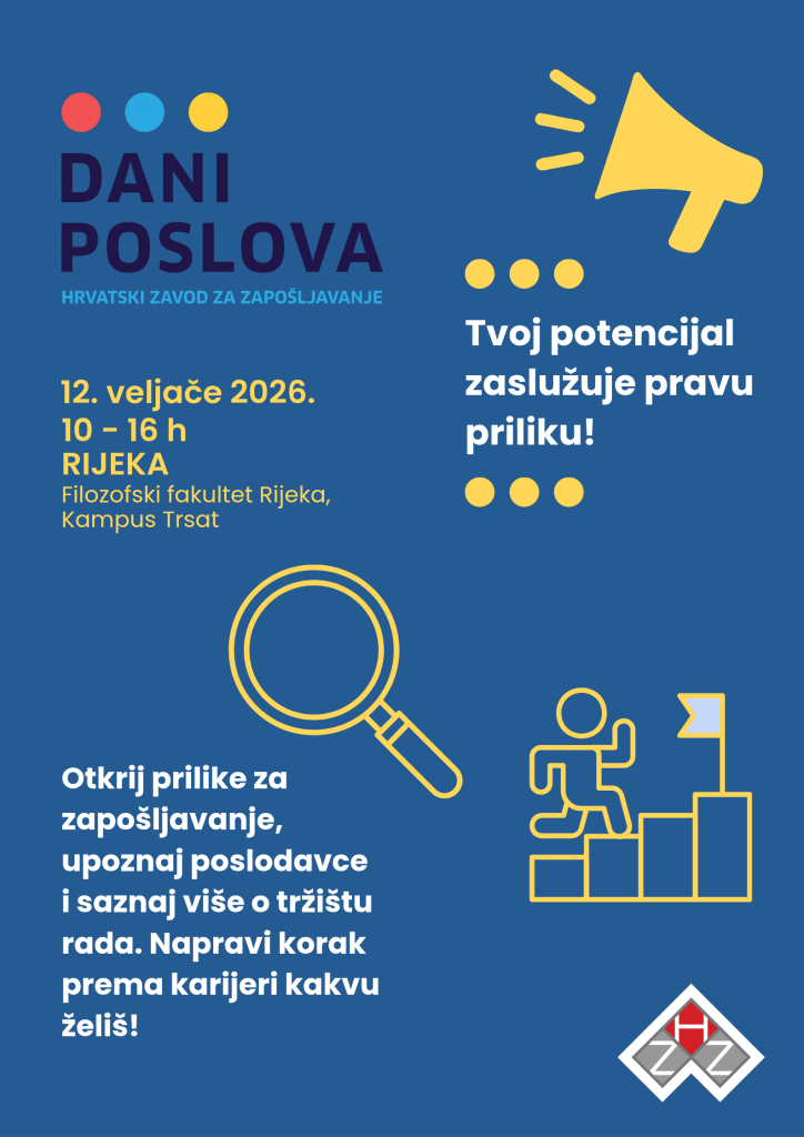 Hrvatski zavod za zapošljavanje Vas poziva na Dane poslova koji će se održati 12. veljače 2026. od 10:00 do 16:00 sati na Filozofskome fakultetu u Rijeci. Dani poslova su sajamsko-edukativno događanje koje za cilj ima: